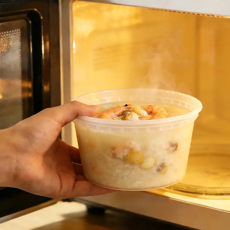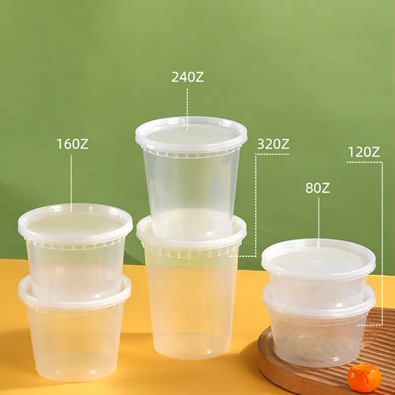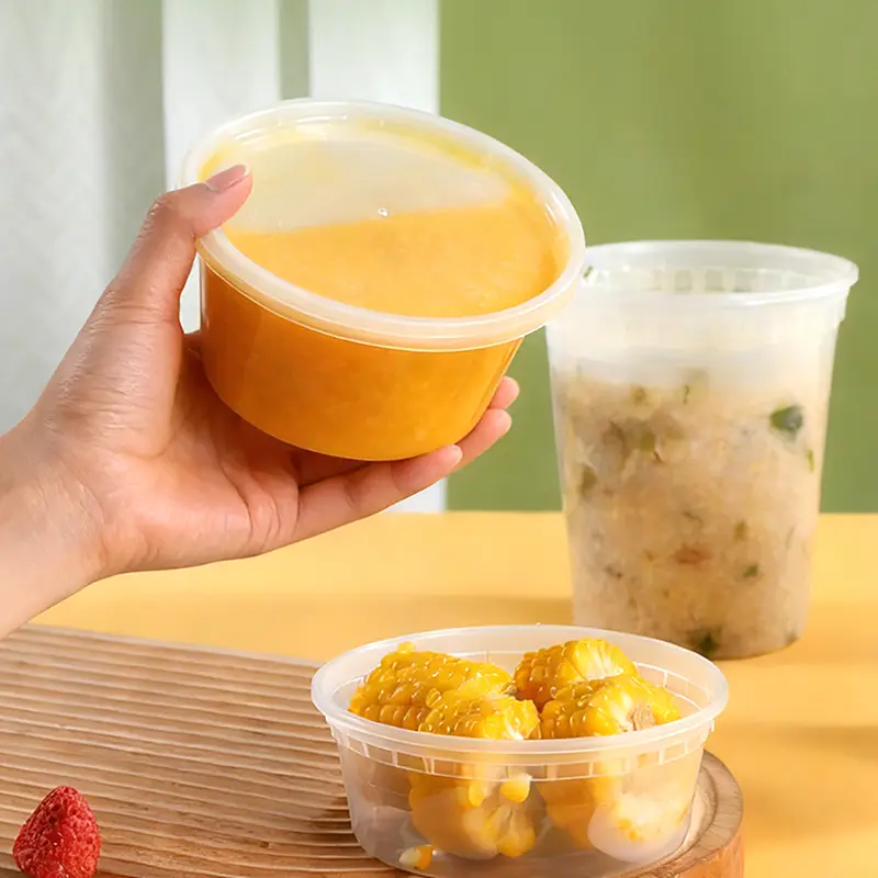 Suchen Sie in China nach einem Großhandel mit 12 Unzen durchsichtigen runden Feinkostbehältern aus Kunststoff? Ningbo Powerr Plastic Products Co., Ltd ist eine gute Wahl! Unser Behälter ist für leichte Mahlzeiten, Desserts, Snacks, Nüsse und Suppen konzipiert. Der aufsteckbare Deckel sorgt für einen dichten, auslaufsicheren Verschluss, widersteht Stößen und verhindert ein Verschütten während der Lieferung. Aus lebensmittelechtem Material gefertigt, eignet es sich für kalte und warme Speisen, unterstützt die Kühlung, das Erhitzen in der Mikrowelle (Deckel ab) und die Reinigung in der Spülmaschine. Das stapelbare Design mit geraden Seiten spart bis zu 25 % Stauraum, ideal für kleine Küchen. Der aufsteckbare Deckel dichtet schneller ab und sorgt so für einen effizienten Betrieb zu Spitzenzeiten. Klare Gehäuse präsentieren Lebensmittel, um den Kauf anzukurbeln, während bedruckte Designs die Markenidentität von Cafés und Essenssets für die ganze Familie stärken.