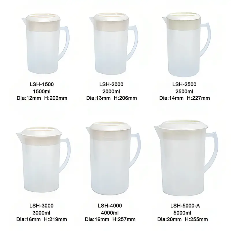 Ningbo Powerr Plastic Products Co., Ltd ist einer der besten Hersteller von 1500–5000 ml Kaltwasserkrügen aus PP-Kunststoff in China. Dieses Design hat sechs verschiedene Spezifikationen, siehe untenstehendes Blatt. Zusätzlich haben wir den Krug mit einem Doppellochdeckel ausgestattet. Vom täglichen Familiengebrauch bis zum professionellen Einsatz bietet es ein einziges Design, das auf unterschiedliche Bedürfnisse eingeht und jede Nutzung bequem und effizient macht. Wenn Sie Interesse an dieser Serie haben oder andere Materialien und Größen benötigen, kontaktieren Sie uns gerne!