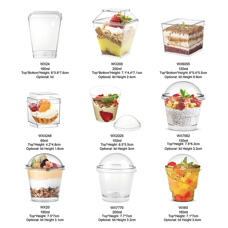 Die Stile sind vielfältig und die Kompatibilität ist stark, passend für verschiedene Desserts und Anlässe. Die Artikel mit Deckel eignen sich zum Tragen und Transportieren von Lebensmitteln. Der Stil mit kleinem Fassungsvermögen kann als Probierbecher verwendet werden. Der Stil mit großer Kapazität kann den Anforderungen von Versammlungen gerecht werden.